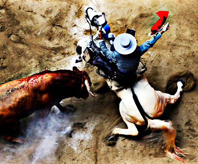 Foto por Henry Agudelo – Premio World Press Photo 2006. El rejoneador español Andy Cartagena en la plaza de toros La Macarena.