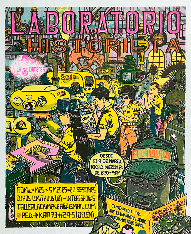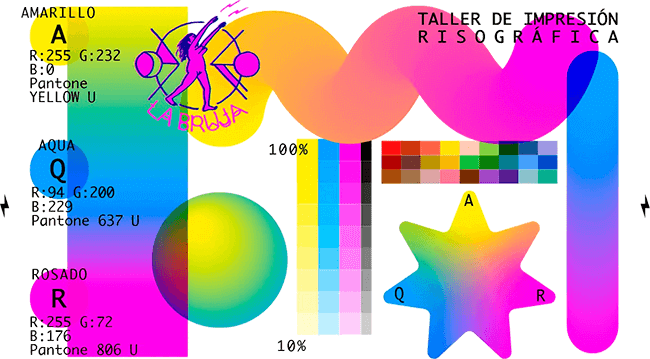 La impresora risográfica «La Bruja» es la protagonista del taller La Bruja Riso, creado en Medellín en febrero de 2019. La impresión risográfica (o RISO) funciona como una especie de mezcla entre serigrafía y litografía (offset) en una máquina similar a una fotocopiadora. En otras palabras, es una especie de automatización de la serigrafía que funciona sobre sustratos de papel. La tecnología de la RISO es prácticamente la misma desde su creación en los años setenta en Japón. El sistema, que venía en desuso desde hace décadas, fue recobrando fuerza gracias a artistas gráficos que reconocieron el potencial creativo de este método de impresión, que además tiene un eficiente consumo de energía y no necesita solventes para secar las tintas. El equipo de La Bruja Riso le apuesta a esta técnica por las ventajas que les brinda a los artistas de la región y en su sede, en la que nunca falta la cerveza fría para compartir, realizan talleres, exposiciones y presentaciones de libros y otros proyectos artísticos.