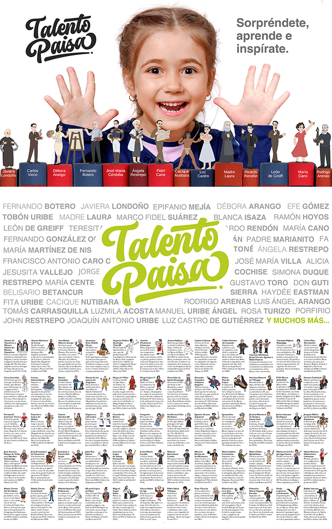 En este contexto crearon «Talento Paisa», iniciativa que igualmente difunde entre las nuevas generaciones de Antioquia los personajes que forman parte de la identidad de la región para que su legado se mantenga vivo por medio de la inspiración que suscitan sus valores y sus obras. Su propósito es completar pronto las reseñas e ilustraciones de un centenar de personajes antioqueños de todos los tiempos para tener un primer conjunto de hombres y mujeres que representan el «talento paisa». Las ilustraciones formarán parte de un rompecabezas con el que se financiará parcialmente la iniciativa y se facilitarán gratuitamente las fichas didácticas de los personajes a los centros educativos que deseen utilizar el material.