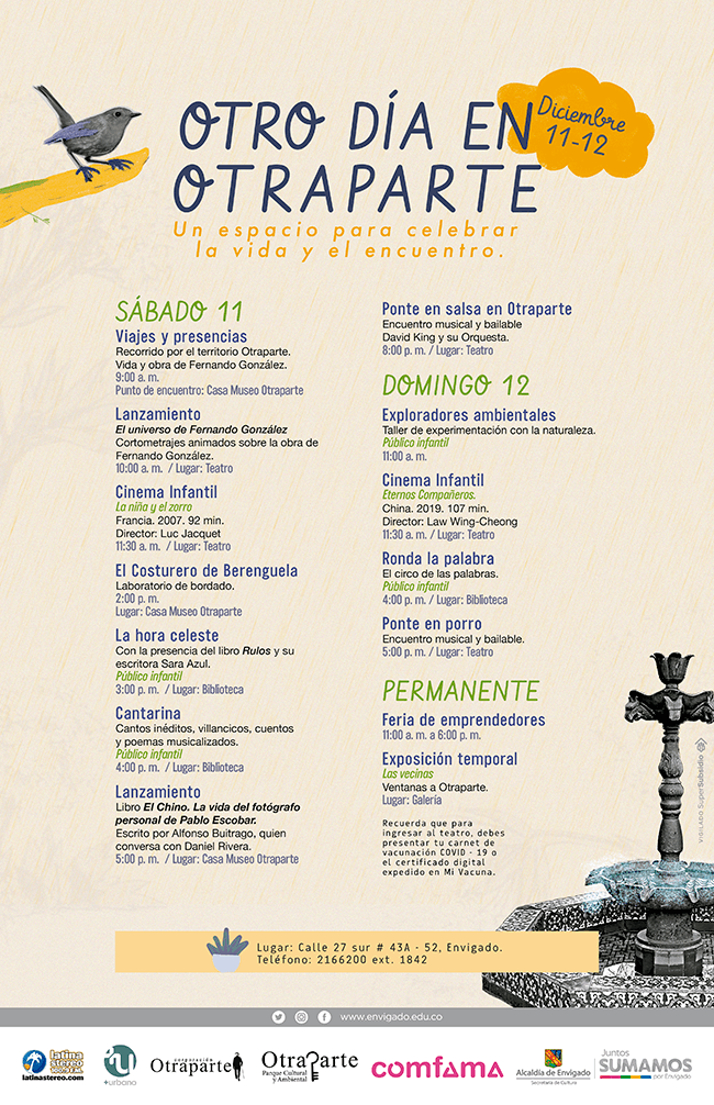 «Otro día en Otraparte» es un espacio para celebrar la vida y el encuentro alrededor de la música, el cine y la literatura. Dos días para compartir y disfrutar en familia de música en vivo, cine, conversaciones literarias, feria de emprendedores, juegos y otras actividades culturales. Evento del Parque Cultural y Ambiental Otraparte que se realiza gracias a la articulación de la Alcaldía de Envigado, Comfama y la Corporación Otraparte.