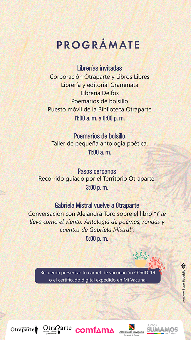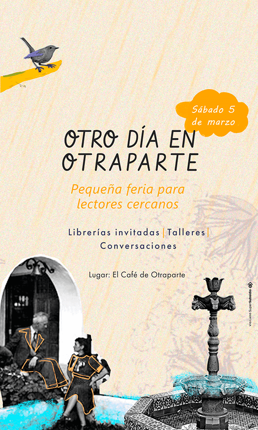 «Otro día en Otraparte» es un espacio para celebrar la vida y el encuentro alrededor de la cultura. Un día para compartir y disfrutar en familia de libros, poesía, conversaciones y café en un amoroso tejido de lectores cercanos que se dan cita en El Café de Otraparte para acompañar y celebrar la bella y necesaria tarea de las editoriales y las librerías independientes de nuestra región. Evento del Parque Cultural y Ambiental Otraparte que se realiza gracias a la articulación de la Alcaldía de Envigado, Comfama y la Corporación Otraparte. ¡Los esperamos!