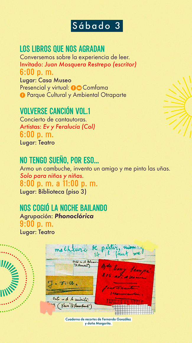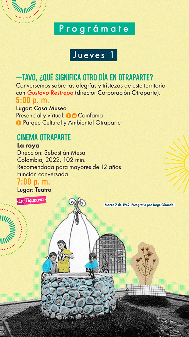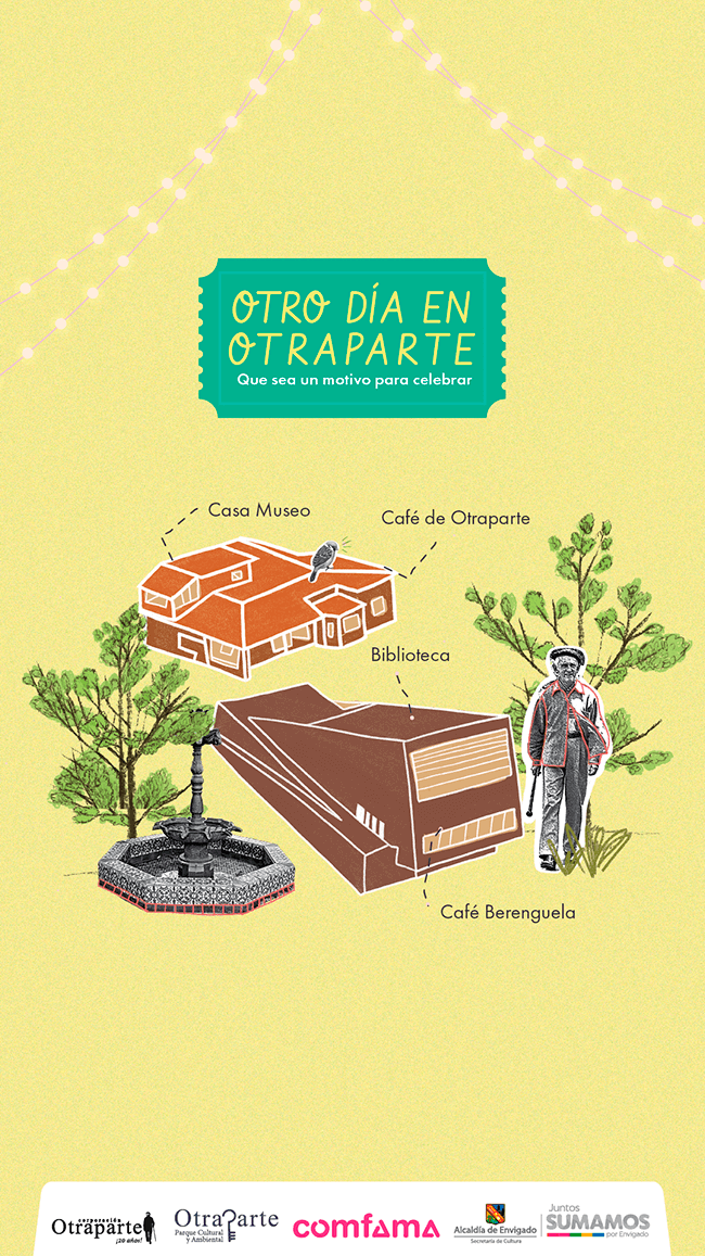 «Otro día en Otraparte» es un espacio para celebrar la vida y el encuentro alrededor de la cultura. Esta feria del Parque Cultural y Ambiental Otraparte se realiza gracias a la articulación de la Alcaldía de Envigado, Comfama y la Corporación Otraparte. ¡Los esperamos!