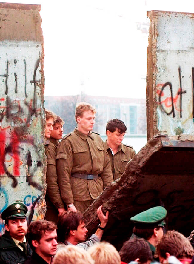 Guardias fronterizos de Alemania del Este miran a través de un agujero en el muro de Berlín después de que los manifestantes derribaran un segmento del muro en la puerta de Brandenburgo el sábado 11 de noviembre de 1989. Foto © Lionel Cironneau | AP.