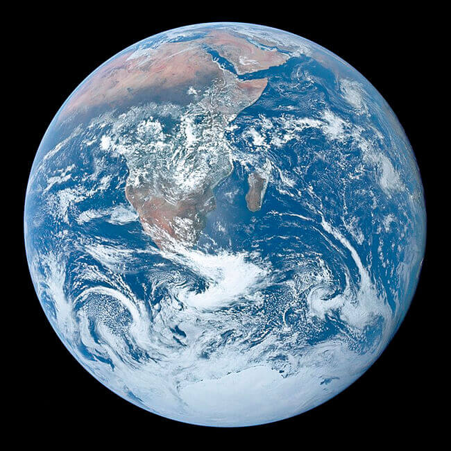 Fotografía tomada a una distancia de aproximadamente 29.000 kilómetros el 7 de diciembre de 1972 por la tripulación de la nave espacial Apolo 17 en ruta hacia la Luna. En esta hermosa imagen del planeta Tierra, conocida como «La canica azul», se pueden apreciar África, la Antártida y la península arábiga.