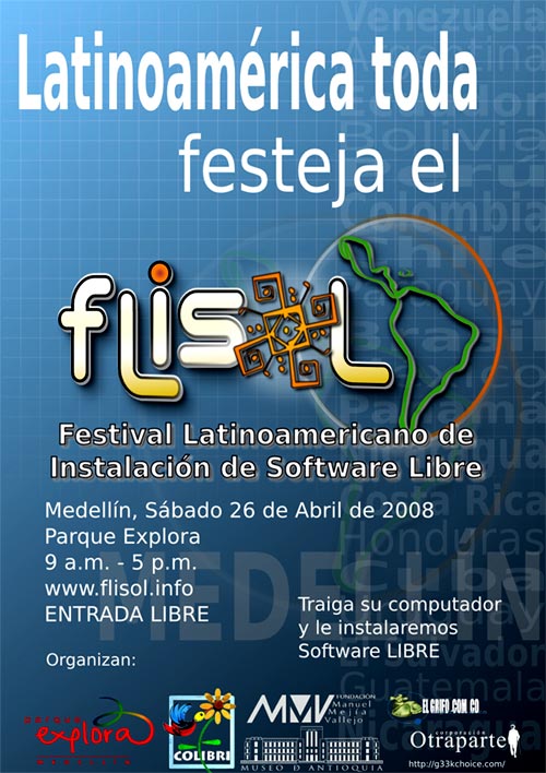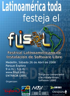 El Festival Latinoamericano de Instalación de Software Libre (FLISOL) es el evento de difusión de este tipo de programas más grande en América Latina. Se realiza desde 2005 y su principal objetivo es promover el uso de esta tecnología y exponer ante el público general su filosofía, alcances, avances y desarrollo. La Corporación Otraparte se une a este proyecto mediante una exhibición preliminar de lo que se mostrará con mayor detalle el sábado 26 de abril en el Parque Explora de la ciudad de Medellín.