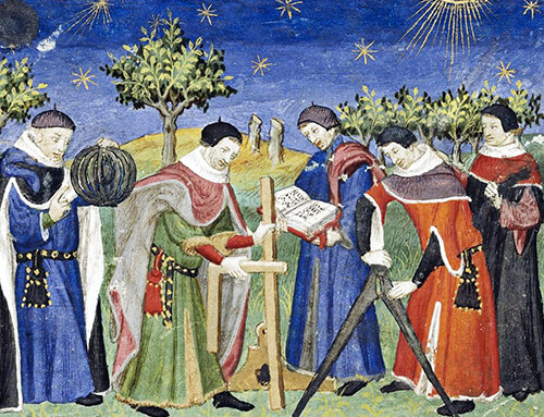 Paisaje con clérigos estudiando astronomía y geometría, mostrando una esfera armilar, escuadra, compás, etc. Fragmento de la miniatura del libro La Vraye Histoire du Bon Roy Alixandre, Francia, principios del siglo xv. (The British Library).