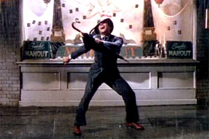 Don Lockwood baila y canta sin cesar. Las calles vacías y la lluvia pertinaz le sirven de escenario. El beso de despedida que le dio su nuevo amor, Kathy Selden, lo ha ahogado sin duda en el júbilo de la alegría. Pasa al lado de una droguería, del estudio de Música Richard Carlane, de la tienda La Valle Millinery, de la librería First Edition y de la Escuela de Arte Mount Hollywood, mientras salta, canta, baila, se trepa en los postes de la luz y chapotea con sus pies en los charcos. De repente, decide guardar su paraguas para enfrentarse al refrescante sentimiento que produce el contacto con el agua. Sin detenerse, sigue cantando, bailando, disfrutando de aquel indescriptible sentimiento. De pronto, a lo lejos, se acerca un atónito y sorprendido policía que al ver su extraña actitud le pregunta: “¿Qué hace?”, y él, totalmente inmerso en su felicidad, le responde: “Estoy bailando y cantando bajo la lluvia”.