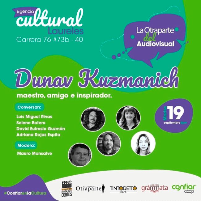 La Corporación Dunav Kuzmanich invita a la conversación de Mauricio Monsalve de la Corporación Otraparte con la realizadora audiovisual Adriana Rojas Espitia, la periodista Selene Botero y los escritores David Eufrasio Guzmán y Luis Miguel Rivas en torno al legado del cineasta chileno Dunav Kuzmanich en el decimoquinto aniversario de su muerte.