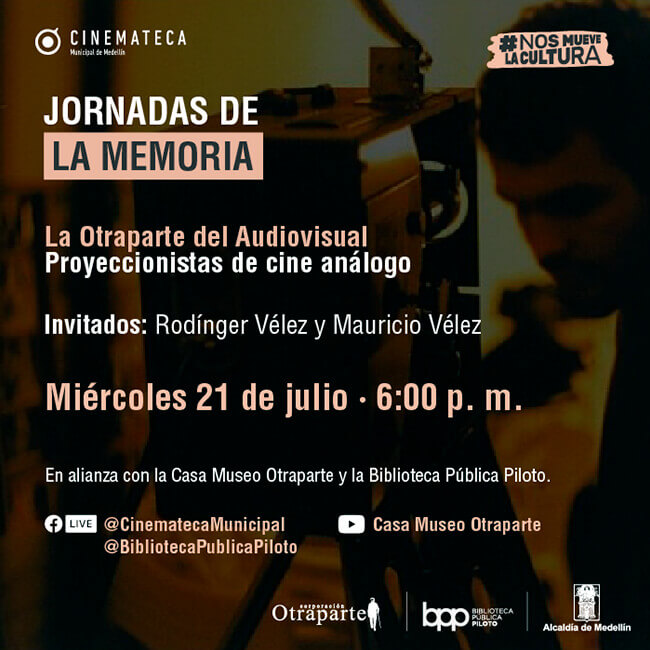 Jornadas de la Memoria es un espacio creado para conversar sobre el patrimonio fílmico nacional y sus protagonistas. En esta ocasión, en alianza con la Biblioteca Pública Piloto y la Corporación Otraparte, la Cinemateca Municipal de Medellín, programa adscrito a la Secretaría de Cultura Ciudadana, dedica el encuentro de su tradicional programa a los proyeccionistas de cine análogo. Conversación de los invitados Rodínger Vélez y Mauricio Vélez con Ana María Ramírez de la Cinemateca Municipal y Mauricio Quintero de la Corporación Otraparte. Recordaremos especialmente a nuestro común amigo Eladio Cañas Restrepo (1970-2004), pionero del Cine en Otraparte.