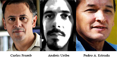 Epitafio(Andrés Uribe Botero) Aquí no yace * * * En mi vida(Carlos Framb) Por lo menos un instante Llega un momento cada noche Anudando mis dispersos instantes de gozo He visto a toda grandeza asumir De la naturaleza humana he aprendido La sangre de mi cuerpo sabe El fondo de mi alma sabe Y he de resignarme —a falta de un verbo * * * Los poetas insisten(Pedro Arturo Estrada) Los poetas después del silencio insisten en no darse por enterados. Y entonces el mundo les da la espalda una vez más, sepultándolos entre aplausos y antologías herrumbrosas mientras continúa alegremente el festín sangriento. Los poetas insisten. Vuelven a decir lo mismo. No se rinden. Y ese es el peligro. |