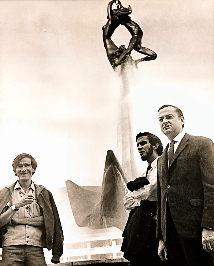 Gonzalo Arango, Samuel Vásquez y Leonel Estrada en la Universidad de Antioquia durante la segunda Bienal de Arte Coltejer en Medellín en 1970.