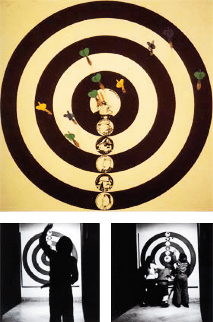 «Julio Le Parc montó sus obras de participación para que el espectador “volteara los mitos” de un pelotazo, o “eligiera sus enemigos” (maternidad, colonialismo, sexo, Tío Sam, Mickey, militares, religión), para clavarles un dardo, haciendo de su instalación una feria de diversiones, mientras personalmente hacía una encuesta a los asistentes y les repartía un documento político que disgustó de manera exagerada a Leonel Estrada y a las directivas de Coltejer».