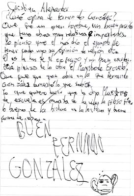“¿Qué opina de Fernando González?: Que fue un gran hombre, un gran escritor, que tuvo obras muy relativas e importantes. Yo pienso que él nos dio el ejemplo de tener cada uno su opinión de religión etc. El es la luz de el esfuerzo y un buen escritor.
