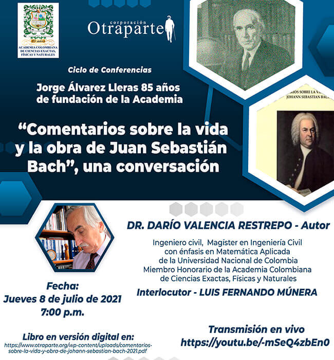 Saludo de Enrique Forero, presidente de la Academia Colombiana de Ciencias Exactas, Físicas y Naturales, y conversación de Darío Valencia Restrepo con Luis Fernando Múnera López, ingeniero civil, maestro en Ciencia (Colorado State University), exdirector de Control Interno de EPM, miembro correspondiente del Centro de Historia de Santa Fe de Antioquia y miembro de número de la Academia Antioqueña de Historia. El autor compartirá seis ejemplos musicales en video en este encuentro que se organiza en el contexto del «Ciclo de conferencias “Jorge Álvarez Lleras – 85 años de la fundación de la Academia”». Descargue aquí el libro en formato pdf.