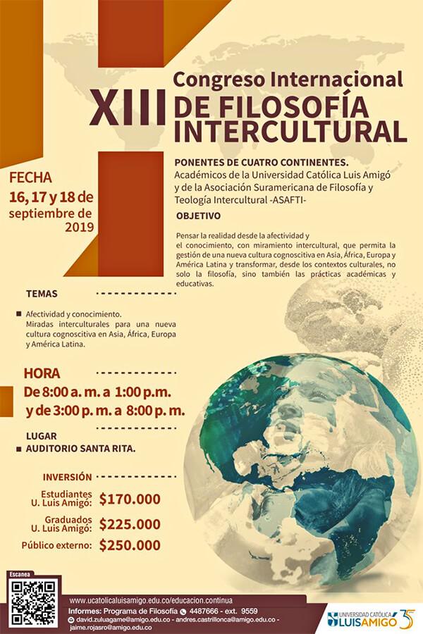 Los Congresos Internacionales de Filosofía Intercultural (CIFI) tienen el propósito de superar el modelo monocultural de la reflexión filosófica a partir del intercambio de conocimiento entre diferentes culturas. Se iniciaron en 1995 y desde entonces se han celebrado en Alemania, Argentina, Austria, Brasil, Corea del Sur, Costa Rica, España, India, México y República Dominicana. La decimotercera versión se realizará en la Universidad Católica Luis Amigó entre el 16 y el 18 de septiembre de 2019.