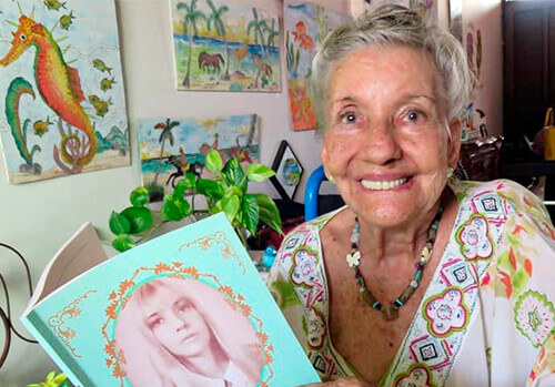 Dina Merlini (1940) es poeta colombiana de ascendencia italiana. En 1958, año de la creación del nadaísmo, conoció a su fundador Gonzalo Arango y fue la primera mujer en unirse al movimiento, cuyos integrantes se reunían en el salón Versalles, el café Metropol o el bar Miami en Medellín, espacios que antes eran solamente frecuentados por hombres. A comienzos de la década del sesenta, en compañía de Helenita Restrepo, Patricia Ariza y otros nadaístas, viajó a una isla en el Pacífico colombiano, aventura que más tarde fue narrada por Elmo Valencia en su novela «Islanada». Días antes de partir, Jotamario Arbeláez le propuso en Cali «el fastuoso proyecto de pintar a una modelo que no podía ser otra que ella, pero no con pinceles sino con mi máquina de escribir de teclas de seda […], despojada de vestimenta en tanto yo la tecleaba, describiéndola ojo por ojo y diente por diente». El libro resultante, «El cuerpo de ella», se mantuvo inédito hasta 1999, cuando ganó el concurso del Instituto Distrital de Cultura de Bogotá. Hacia finales de los años sesenta e inicios de los setenta se vinculó a proyectos artísticos como Taller de Artes de Medellín, Teatro El Local, Teatro Máscaras con Ramiro Corzo, Álvaro Daza y Jairo Aníbal Niño, y el Teatro La Candelaria junto a Santiago García y Patricia Ariza. Igualmente recibió la influencia de las propuestas del dramaturgo Enrique Buenaventura, incursionó como modelo en la televisión con el apoyo de Jimmy Salcedo y fue actriz de radioteatro en la Radio Nacional de Colombia con el actor y libretista Víctor Muñoz Valencia. En la década del ochenta decidió abandonar la capital y trasladarse a la isla de San Andrés, donde coincidió con Simón González, más tarde intendente y gobernador, y sus compañeros nadaístas, la pintora Fanny Salazar, el pintor Samuel Ceballos y el poeta René Rebetez, entre otros artistas. Después de años de dedicación a la pintura y a la docencia, entre lienzos y caballos de mar, en 2019 publicó «Solaz Atardecer y Maravilla», su primer libro de poesía, publicado por la Corporación Colombiana de Teatro.