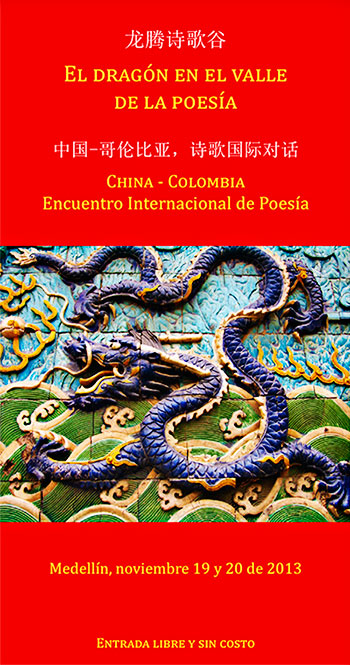 El Festival Internacional de Poesía de Medellín, la Compañía Zhongkun (China) y el Movimiento Poético Mundial invitan al encuentro China – Colombia (El dragón en el valle de la poesía), que incluirá siete lecturas de poemas (noviembre 19 – 20) con la participación de siete poetas chinos y siete poetas colombianos. Es la primera vez que una delegación amplia de poetas y escritores del país asiático visita Latinoamérica, y sólo tendrá contacto con el público en Buenos Aires (Argentina) y Medellín.