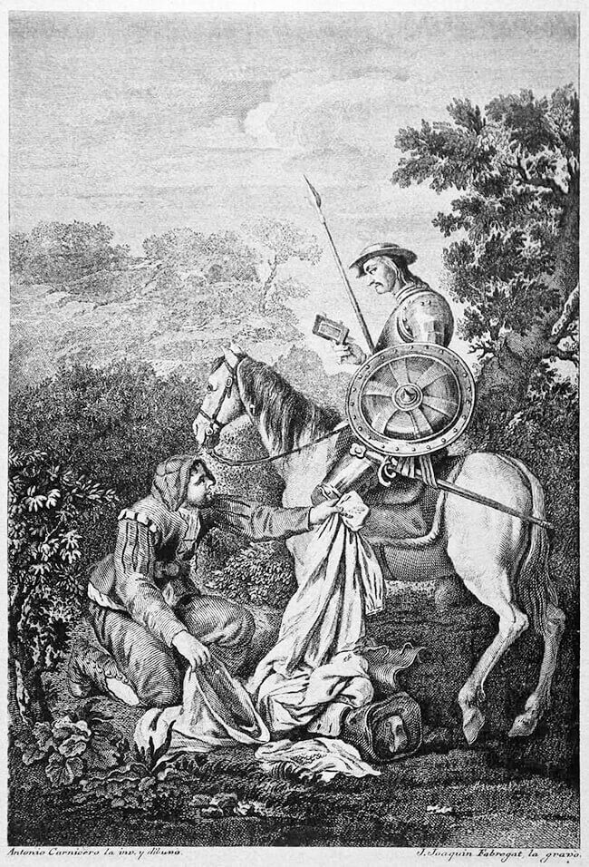 «Don Quijote y Sancho revisan el contenido de la maleta». Ilustración de Antonio Carnicero (1748-1814) y grabado de José Joaquín Fabregat (1748-?). Imagen tomada de Cervantesvirtual.com.