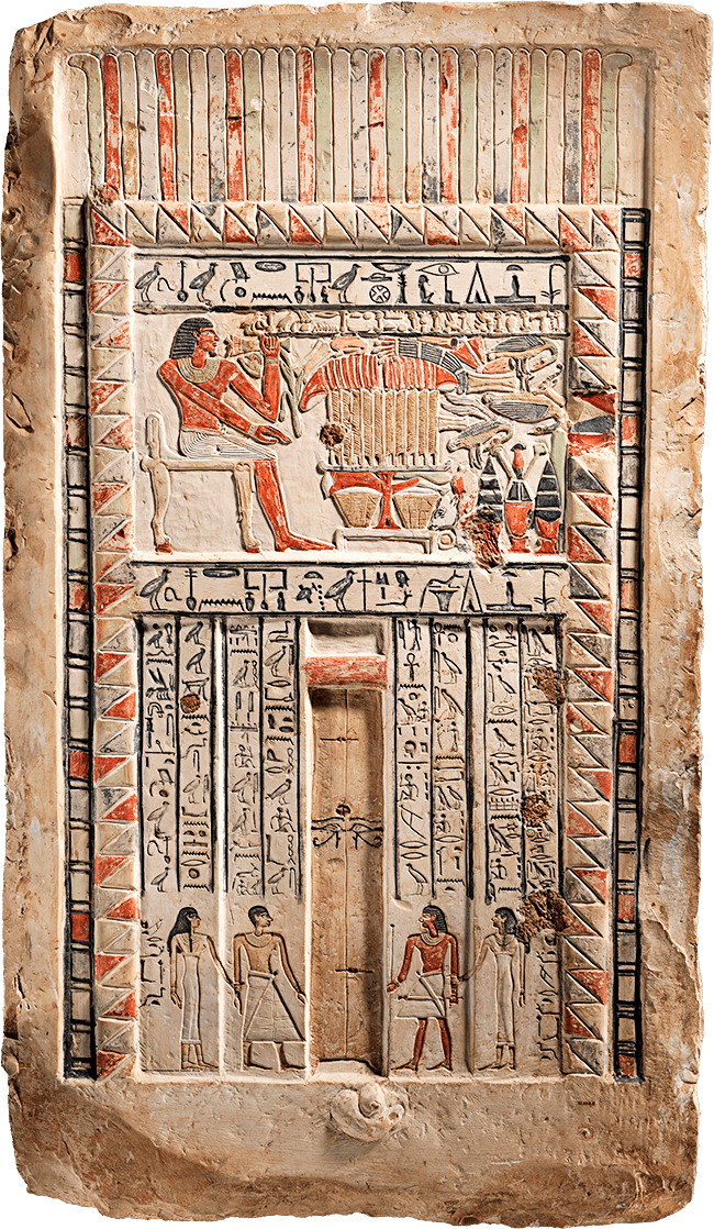 Puerta falsa del sellador real Neferiu (Reino Antiguo, circa. 2150-2010 A.C.). Los egipcios creían que el alma del difunto podía entrar y salir libremente de la tumba a través de una «puerta falsa», que se caracterizaba por una superficie empotrada con una entrada simbólica en el centro. A principios del Reino Medio, el diseño de la puerta falsa se combinó con otros elementos en estelas rectangulares. Este monumento del Primer Periodo Intermedio ejemplifica el inicio de ese proceso. Los textos inscritos en las jambas que flanquean la puerta doble proclaman las buenas acciones y logros del propietario. Fuente: Metmuseum.org