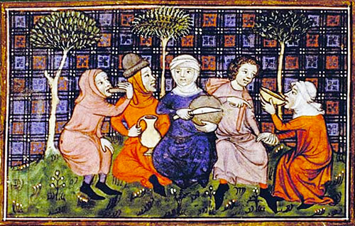 Reparto de pan y vino entre campesinos, Livre du Roi Modus et de la Reine Ratio, Francia, siglo xiv (Bibliothèque nationale de France).