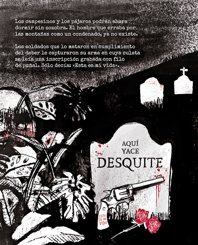 Sí, nada más que una rosa, pero de sangre. Y bien roja como a él le gustaba: roja, liberal y asesina. Porque él era un malhechor, un poeta de la muerte. Hacía del crimen una de las más bellas artes. Mataba, se desquitaba, lo mataron. Se llamaba «Desquite». De tanto huir había olvidado su verdadero nombre. O de tanto matar había terminado por odiarlo.