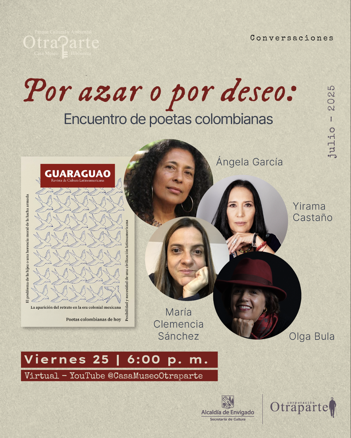 La Casa Museo Otraparte presenta un nuevo encuentro del ciclo virtual Por azar o por deseo, una serie de conversaciones con poetas colombianas cuya obra fue recogida en la antología preparada por María Clemencia Sánchez y Olga Bula para la revista Garaguao de la Universidad Autónoma de Barcelona.