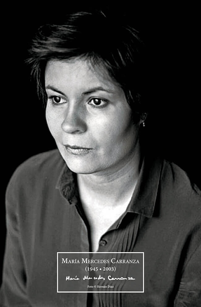 María Mercedes Carranza (Bogotá, 24 de mayo de 1945 – 11 de julio de 2003) se licenció en Filosofía y Letras en la Universidad de los Andes con el trabajo de grado «Carranza por Carranza», publicado en 1985 por Procultura. Como periodista cultural dirigió las páginas literarias «Vanguardia» de El Siglo de Bogotá y «Estravagario» de El Pueblo de Cali. Durante trece años ejerció como jefe de redacción del semanario Nueva Frontera, participó en la Asamblea Nacional Constituyente en 1991 y fue fundadora y directora de la Casa de Poesía Silva desde 1986. Entre sus obras se cuentan «Vainas y otros poemas» (Ponce de León, 1972), «María Mercedes Carranza» (Revista Golpe de Dados, Vol. VII-XL, 1979), «Tengo miedo» (Oveja Negra, 1983), «Hola, soledad» (Oveja Negra, 1987), «Vainas» (Antología, Fundación Simón y Lola Guberek, 1987), «Poemas» (Antología, Centro Colombo Americano, 1988), «Antología personal» (Revista Golpe de Dados, Vol. XVII-CI, 1989), «Antología poética» (Colección de Poesía V Centenario, 1990), «Obra incompleta» (Leyva Durán Editores, 1991), «Maneras del desamor» (Revista Golpe de Dados, Vol. XXI-CXIII, 1993), «Amor y desamor» (con litografías de Luz Ángela Lizarazo, edición para bibliófilos y coleccionistas, Galería Garcés Velásquez y Artes Dos Gráfico, 1994), «De amor y desamor y otros poemas» (Norma, 1995), «El canto de las moscas – Versión de los acontecimientos» (Arango Editores, 1998; Debolsillo, Barcelona, 2001), «María Mercedes Carranza» (Corporación de Artes, Sabaneta, 1999), «La patria y otras ruinas» (Colección de Poesía Palimpsesto, Carmona, España, 2004), «Poesía completa y cinco poemas inéditos» (edición al cuidado de Melibea, Alfaguara, 2004), «Poesía completa» (con prólogo de Darío Jaramillo Agudelo, Editorial Sibila, Sevilla, España, 2010), «Poesía reunida & 19 poemas en su nombre» (Letra a Letra, 2013) y «I. Su poesía – II. 7 ensayos sobre su obra» (Letra a Letra / Instituto Caro y Cuervo, colección Poesía, 3 y 4, 2014).
