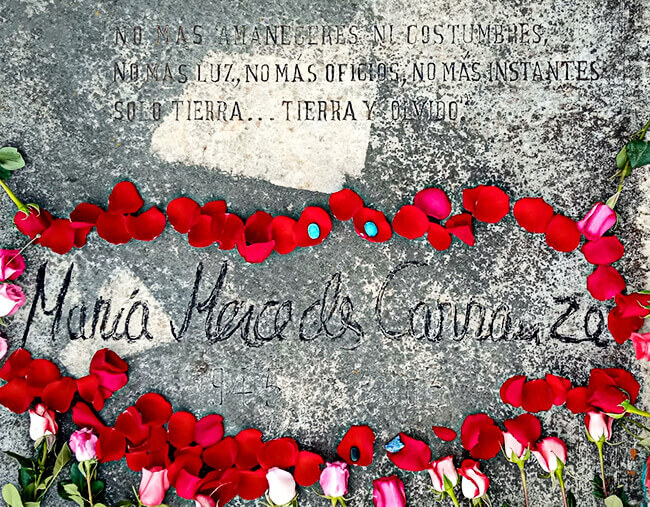 Tumba de María Mercedes Carranza con la siguiente inscripción: «No más amaneceres ni costumbres, no más luz, no más oficios, no más instantes. Solo tierra… Tierra y olvido».