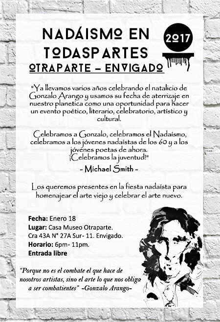 En el aniversario número 86 del nacimiento de Gonzalo Arango (18 de enero de 1931), en diferentes ciudades de Colombia y el mundo sus lectores recordarán al fundador del Nadaísmo. La “Internacional Nadaísta” comenzó en 2014 con la transmisión de la conferencia “Grandeza y miseria de la literatura”, grabación rescatada para la memoria cultural por Michael Smith, creador de la página web “El profeta Gonzalo Arango”. Este año la Corporación Otraparte, Non Colectivo y Revista Innombrable unen fuerzas para hacer de esta fiesta nadaísta una mixtura temporal y artística. Todos están invitados a escuchar las voces nuevas y viejas del arte.