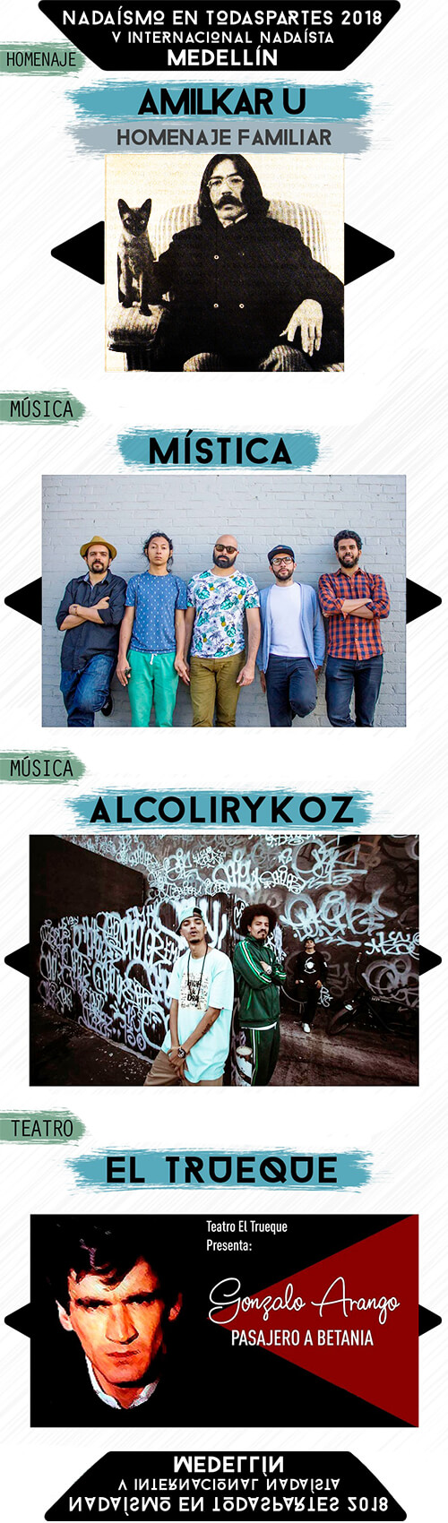 Presentaciones musicales a cargo de las agrupaciones Mística (reggae, ska, rocksteady) y Alcolírykoz (hip hop con influencia de Gonzalo Arango).