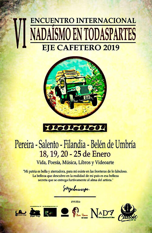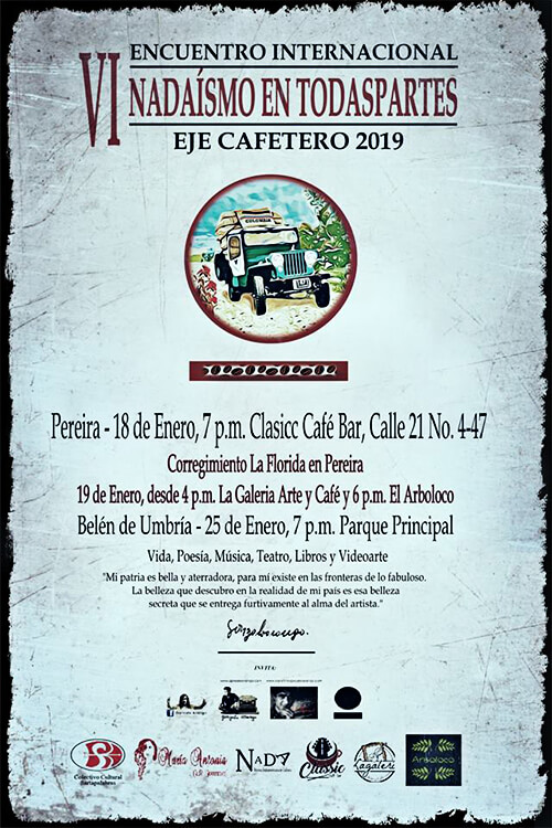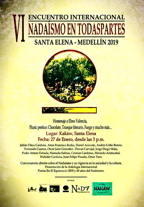 Para empezar el año con poesía celebraremos la vi Internacional Nadaísta con nuestro evento anual «Nadaísmo en Todaspartes». Usamos como excusa el 18 de enero, fecha de nacimiento del poeta Gonzalo Arango. Lo celebramos a él y a su obra. También lo hacemos para motivar y ofrecerle una tarima a esa juventud a la que los nadaístas siempre han convocado.