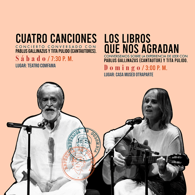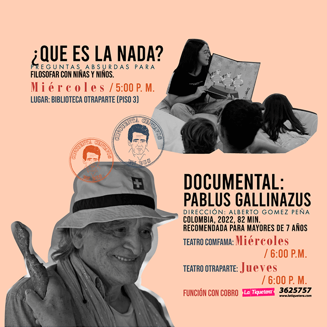 Acompáñanos del 4 al 11 de febrero con música, conversaciones y cine en Teatro Comfama, Plazuela San Ignacio y Otraparte. Nota: La conversación con Pablus Gallinazo y Tita Pulido sobre la experiencia de leer quedó registrada aquí, y la conversación de Jotamario Arbeláez y Cristóbal Peláez en homenaje a Jaime Jaramillo Escobar quedó registrada aquí, ambos enlaces en el canal de YouTube de la Casa Museo Otraparte.