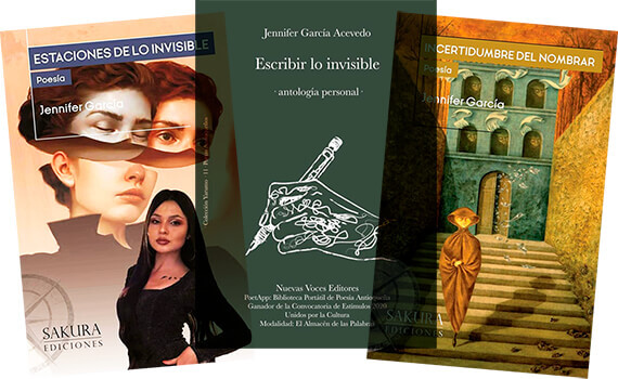Jennifer García Acevedo (Medellín, 1995) es poeta, gestora cultural y tallerista. Ha publicado «Estaciones de lo invisible» (Sakura Ediciones, 2019), «Escribir lo invisible» (antología personal, Nuevas Voces Editores, 2021) e «Incertidumbre del nombrar» (Sakura Ediciones, 2021). Sus poemas han sido publicados en diversas revistas, periódicos y antologías nacionales e internacionales y han sido traducidos al inglés, vietnamita, árabe, francés y creole haitiano. Ha participado en festivales internacionales de cine y literatura y en 2019 obtuvo el Premio Nacional de Poesía José Santos Soto. Es directora del Festival internacional de Poesía de Fredonia.