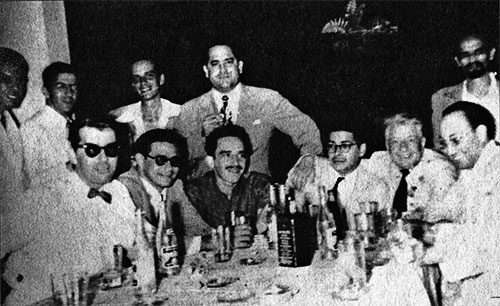 Foto tomada en 1950 por Jorge Rondón, dueño de la Librería Mundo, durante la cena de despedida a Ramón Vinyes, con motivo de su último viaje de regreso a Barcelona. De pie: (izq. a der.) Alfredo Delgado, Carlos de la Espriella, Germán Vargas, Fernando Cepeda y Roca, Orlando Rivera. Sentados: Roberto Prieto Sánchez, Eduardo Fuenmayor, Gabito, Alfonso Fuenmayor, Ramón Vinyes y Rafael Marriaga.