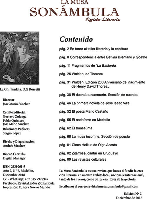 «La Musa Sonámbula» es una revista literaria plural, abierta a todos los escritores y lectores de aquí y de allá, es un espacio que tiene como fin publicar a quienes no han tenido la oportunidad de ser leídos en otros medios. Bajo este concepto nació hace dos años, completando ya siete números en dicha labor de difusión y promoción de la cultura y la literatura de nuestra ciudad con una proyección universal. Circula trimestralmente en edición impresa y digital. Es dirigida por José Mario Sánchez y Gustavo Zuluaga con el apoyo de Pablo Quintero como editor y el respaldo de la empresa privada.