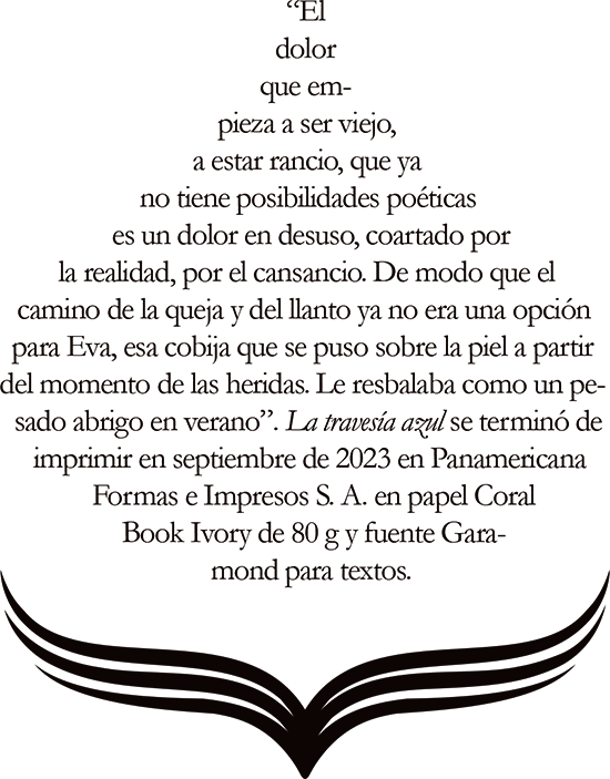 En La travesía azul asistimos al duelo que vive una mujer frente al divorcio, a la finalización de una relación amorosa, al derrumbe del ideal llamado matrimonio. Eva, el personaje principal, nos cuenta a lo largo de la novela —y sin atender a imperativos cronológicos— sus elaboraciones íntimas, dolorosas y espléndidas. Nos relata cómo se cae, cómo se intenta levantar y vuelve a caer, cómo se enamora tercamente de lo que ella de manera sagaz vislumbró desde un principio como ominoso; cómo teje con ayuda de un discurso social una trampa hecha de ideales hasta el riesgo de extraviarse.