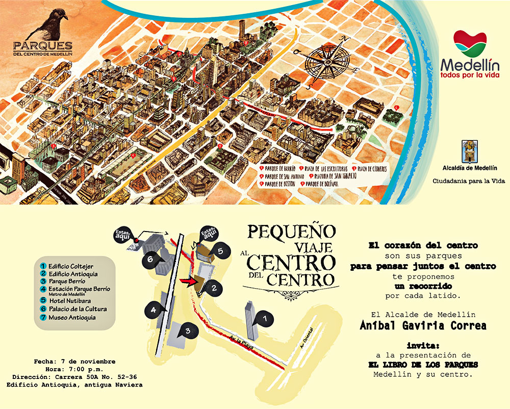 Historias nuevas y viejas, escondidas y sabidas, de los personajes, objetos, sitios, anécdotas y vidas de siete parques del Centro de Medellín están contadas en “El libro de los parques – Medellín y su Centro”, que será lanzado este jueves 7 de noviembre en el Edificio Antioquia (antigua Naviera) a las 7:00 de la noche, con la presencia del alcalde de Medellín, Aníbal Gaviria Correa, y la Secretaria de Cultura Ciudadana, María del Rosario Escobar Pareja. Además del concurso de distintas organizaciones que trabajan por el bienestar del centro.