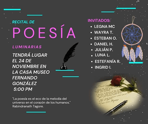 Recital de poesía Luminarias con la participación de las nuevas voces Daniel H., Esteban O., Estefanía R., Ingrid I., Julián P., Legna MC, Luna L. y Wayra T.