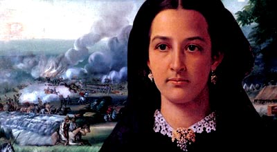 Marcelina Vásquez de Márquez, óleo de Edouard Vienot, y Batalla del río Palo, óleo de José María Espinosa, ambas obras de la colección de pintura del Museo Nacional de Colombia. Detalle de la carátula de Amores sin tregua.