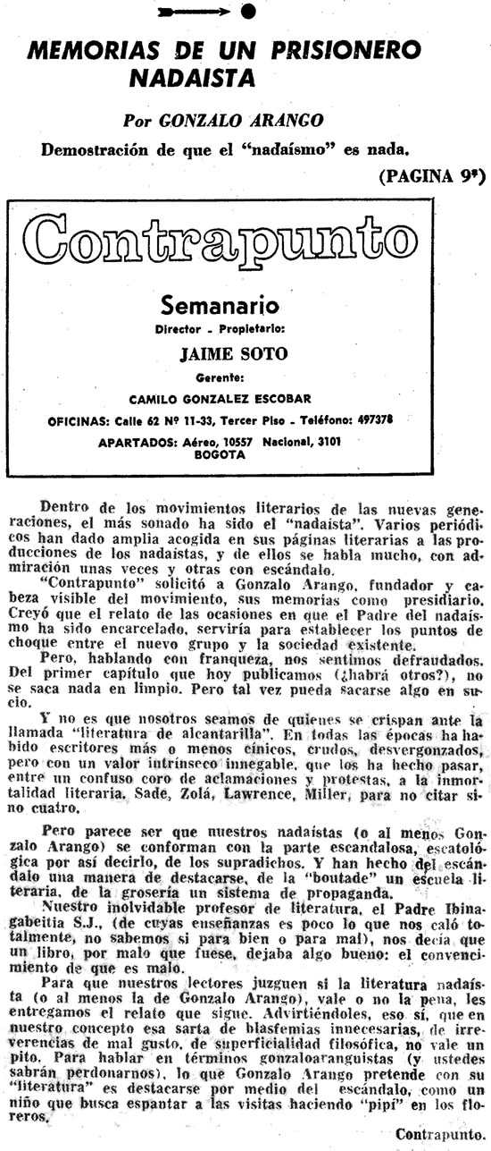 Solo se dio cuenta de que el Nadaísmo era cosa muy fea, cuando oyó en los radioperiódicos la noticia de que yo estaba preso en La Ladera, como un vulgar ladrón de repollos. Pero era por otra razón: por lo del bendito Congreso de Escritores Católicos, instalado solemnemente a las tres de la tarde en el Paraninfo de la Universidad de Antioquia, repleto de frailes y de poetas, de monjas y de ministros de Dios y del trabajo. Le había tocado al pobre Otto representar al Ejecutivo en ese acto de lirismo eucarístico; lo mismo al doctor Panesso Robledo el honor de representar al liberalismo, y todos los otros inteligentes de la plana mayor de la cultura que tenían de católicos lo que yo tenía de arzobispo.