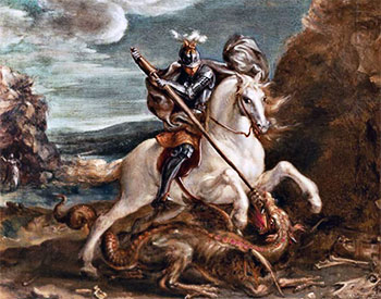 Según la tradición popular, San Jorge era un militar romano nacido en el siglo III en Capadocia (Turquía). Bajo las órdenes del emperador Diocleciano, se negó a ejecutar un edicto del emperador que le obligaba a perseguir a los cristianos. Por esta razón fue martirizado y decapitado por sus coetáneos. Muy pronto se empezó a venerar como santo en la zona oriental del Imperio Romano y enseguida aparecieron historias fantásticas ligadas a su figura. La gesta de San Jorge y el dragón se hizo popular en toda Europa hacia el siglo IX bajo el nombre de “Leyenda áurea” y fue recogida por el arzobispo de Génova, Iacopo da Varazze, más conocido como Iacobus de Vorágine, en 1264, en el libro Legenda sanctorum. En esta versión, sin embargo, la acción transcurría en Libia. La versión de la leyenda más popular en Cataluña explica que en Montblanc (Conca de Barberà) vivía un dragón terrible que causaba estragos entre la población y el ganado. Para apaciguarlo, se sacrificaba al monstruo una persona escogida por sorteo. Un día la suerte señaló a la hija del rey, que habría muerto de no ser por la aparición de un bello caballero con armadura que se enfrentó al dragón y lo mató. La tradición añade que de la sangre derramada nació un rosal. Esta misma leyenda, con ligeras variaciones, se repite en las tradiciones populares de Inglaterra, Portugal y Grecia, entre otros países. El día de “Sant Jordi” es costumbre en Cataluña que los hombres regalen una rosa a sus mujeres, y las mujeres un libro a los hombres por alusión a la leyenda popular.
