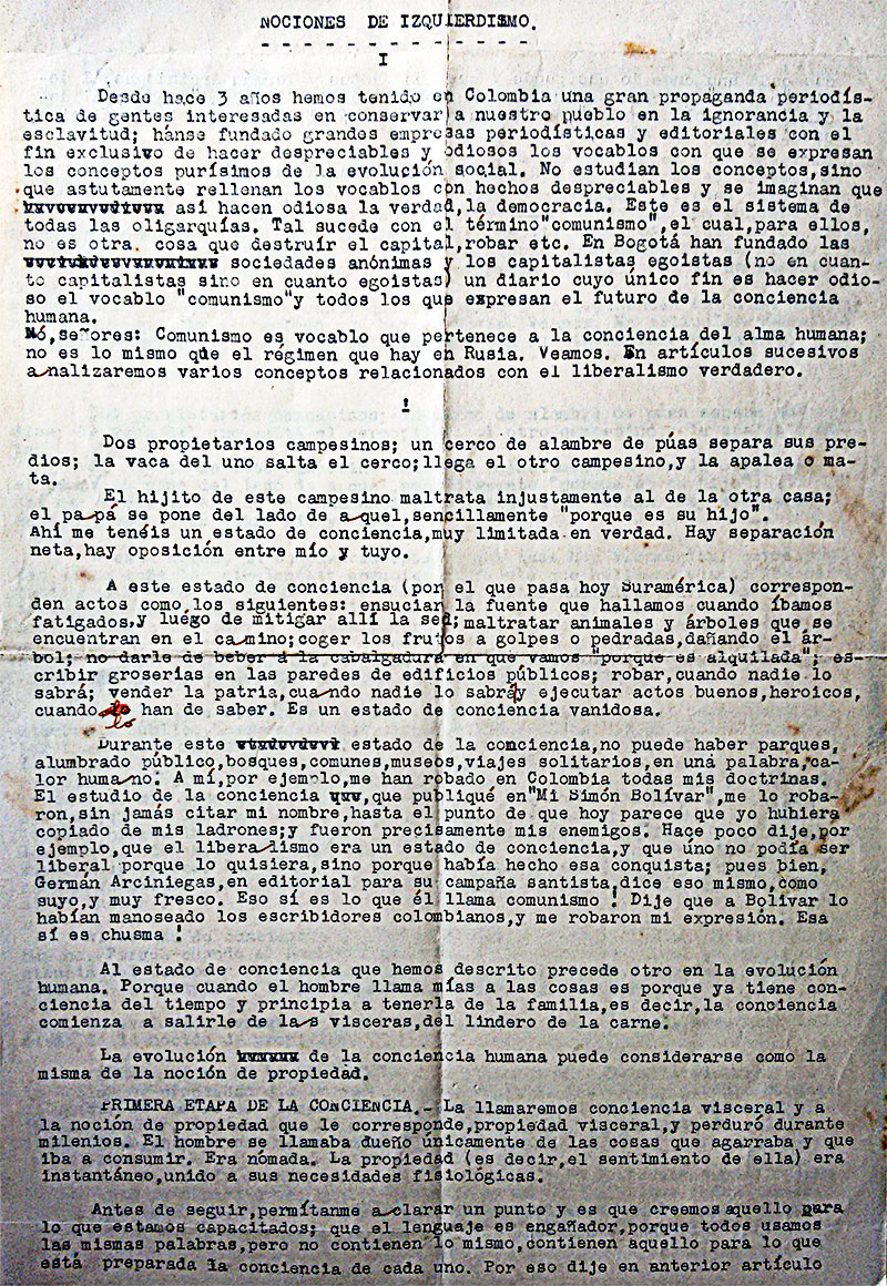 Desde hace tres años hemos tenido en Colombia una gran propaganda periodística de gentes interesadas en conservar a nuestro pueblo en la ignorancia y la esclavitud; hanse fundado grandes empresas periodísticas y editoriales con el fin exclusivo de hacer despreciables y odiosos los vocablos con que se expresan los conceptos purísimos de la evolución social. No estudian los conceptos, sino que astutamente llenan los vocablos con hechos despreciables y se imaginan que así hacen odiosa la verdad, la democracia. Este es el sistema de todas las oligarquías. Tal sucede con el término comunismo, el cual, para ellos, no es otra cosa que destruir el capital, robar, etc. En Bogotá han fundado las sociedades anónimas y los capitalistas egoístas (no en cuanto capitalistas sino en cuanto egoístas) un diario cuyo único fin es hacer odioso el vocablo comunismo y todos los que expresan el futuro de la conciencia humana.