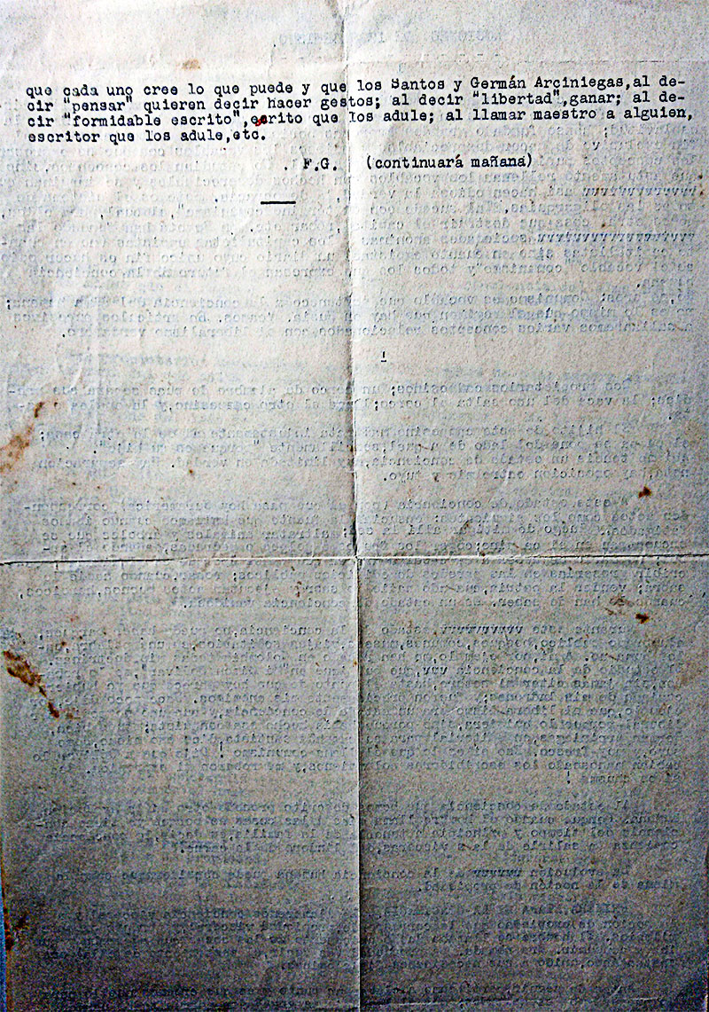 Durante este estado de la conciencia, no puede haber parques, alumbrado público, bosques comunes, museos, viajes solitarios, en una palabra, calor humano. A mí, por ejemplo, me han robado en Colombia todas mis doctrinas. El estudio de la conciencia, que publiqué en Mi Simón Bolívar, me lo robaron, sin jamás citar mi nombre, hasta el punto de que hoy parece que yo hubiera copiado de mis ladrones; y fueron precisamente mis enemigos. Hace poco dije, por ejemplo, que el liberalismo era un estado de conciencia, y que uno no podía ser liberal porque lo quisiera, sino porque había hecho esa conquista; pues bien, Germán Arciniegas, en editorial para su campaña santista, dice eso mismo, como suyo, y muy fresco. ¡Eso sí es lo que él llama comunismo! Dije que a Bolívar lo habían manoseado los escribidores colombianos, y me robaron mi expresión. ¡Esa sí es chusma!