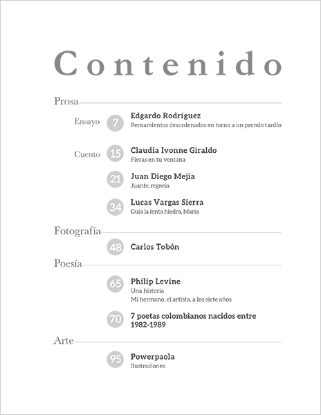 Presentación de la edición número 6 de la revista P&P+arte, publicación semestral de prosa, poesía y arte. Sus editores, como escritores y artistas, buscan participar directamente en el rumbo y el destino del medio cultural del país, formar parte del diálogo vivo que se constituye en una nación e influir en ella, enriqueciéndola. Una revista, atenta a la calidad del material que publica, la categoría de sus colaboradores y el compromiso con el presente —que irá definiendo en su quehacer—, representa siempre una lectura de su época, y cada página, cada volumen, será un reflejo, una versión ficcional de ella. En un país convulso y adolescente, sin una forma feliz aún alcanzada, el Arte y la Poesía son voz y promesa. Sentido valioso de la existencia particular y colectiva. Una botella encontrada con mensaje. P&P+arte es una publicación de Claudia Ivonne Giraldo, Male Correa, Isabel Restrepo, Coste Montenegro, Carolina Londoño y Elkin Restrepo.
