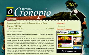 La Revista Cronopio es una publicación mensual de difusión cultural que recién comienza en el inmenso mundo de la red. Es un medio con espíritu heterogéneo que se ve reflejado en su grupo de colaboradores y en las temáticas abordadas. www.revistacronopio.com es el sueño de un grupo de jóvenes recién egresados de la universidad, que se ha venido construyendo lenta y pacientemente, sin contar con amplios recursos, pero sí con el entusiasmo y la dedicación de sus socios. En ella se advierte el trabajo de dos comunicadores sociales, una trabajadora social, un filósofo, un ingeniero forestal y un diseñador.