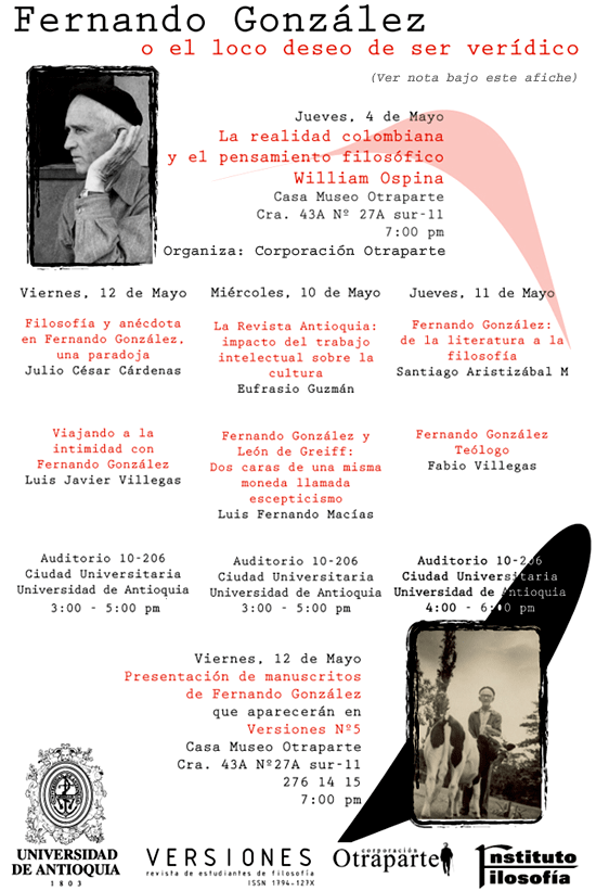 Celebramos el séptimo cumpleaños de Otraparte.org (mayo 3 de 1999) con una interesante y múltiple invitación para los lectores de nuestro boletín. Se trata de una serie de conferencias programadas por la revista “Versiones”, dirigida por estudiantes del Instituto de Filosofía de la Universidad de Antioquia, quienes en asocio con la Corporación Otraparte publicarán en su edición número cinco un extenso fragmento de una libreta inédita de Fernando González Ochoa. La entrada será libre para todos los encuentros que se realizarán entre el 4 y el 12 de mayo de 2006 en la Universidad de Antioquia (10, 11 y 12 de mayo) y la Casa Museo Otraparte (4 y 12 de mayo).