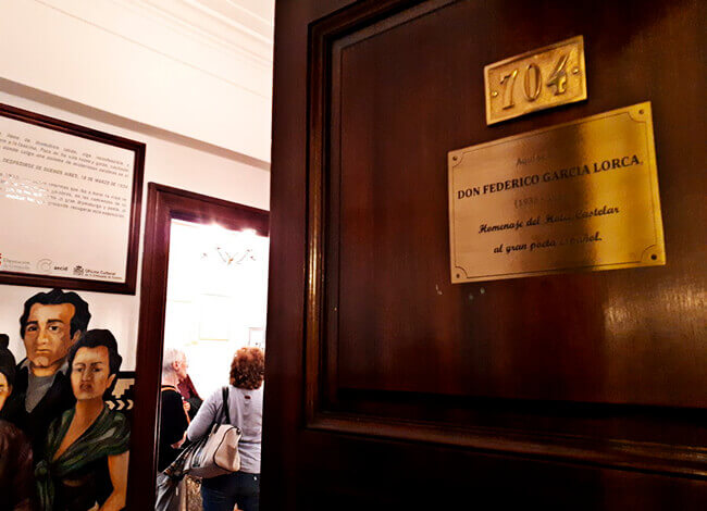 Anécdotas y coplas en una visita guiada con María Cáfora y Marina Cirigliano por la habitación 704 del emblemático Hotel Castelar de la Avenida de Mayo en Buenos Aires, Argentina, donde se alojó el poeta español Federico García Lorca entre 1933 y 1934. Inaugurado en 1929 con el nombre de Hotel Excelsior, otros artistas de antaño que recorrieron los pasillos del Hotel Castelar fueron Alfonsina Storni, Emilio Pettoruti, Jorge Luis Borges, Norah Lange, Oliverio Girondo y Raúl Soldi.