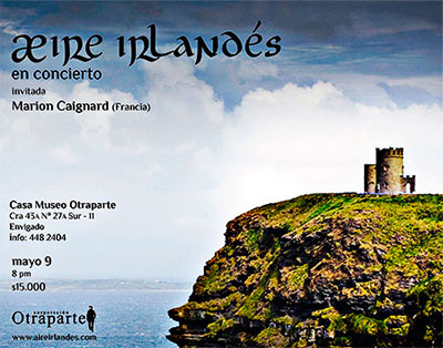 æire irlandés es una agrupación colombiana de música tradicional irlandesa, creada en febrero de 2013 por iniciativa de Carolina Arango (violín), Elizabeth López (voz), David Gaviria (teclado) y Rodrigo Vélez (guitarra). Son músicos con una extensa trayectoria en la interpretación de este género, el cual desean promover en Latinoamérica. El recorrido académico de Carolina y Elizabeth en la Universidad de Limerick (Irlanda) brinda un fuerte soporte conceptual a la propuesta, que sumado a las ideas de Rodrigo y David hacen de æire irlandés un grupo innovador y vital. En este concierto el público tendrá la oportunidad de disfrutar del ensamble entre æire irlandés y la acordeonista francesa Marion Caignard, quien ha estudiado la música tradicional de su región (Bretaña) desde los ocho años de edad. Un interés que aumentó durante la adolescencia y la llevó a tocar la bombarda, instrumento de viento con el que ha representado a su ciudad en competencias regionales. A Colombia llegó en 2007 y desde entonces toca con el grupo de música celta Perceval de Bogotá. Así mismo, en 2012 inició un dueto de acordeón diatónico y violín con Carolina Arango, con quien conformó la agrupación Fola en compañía de dos músicos argentinos.