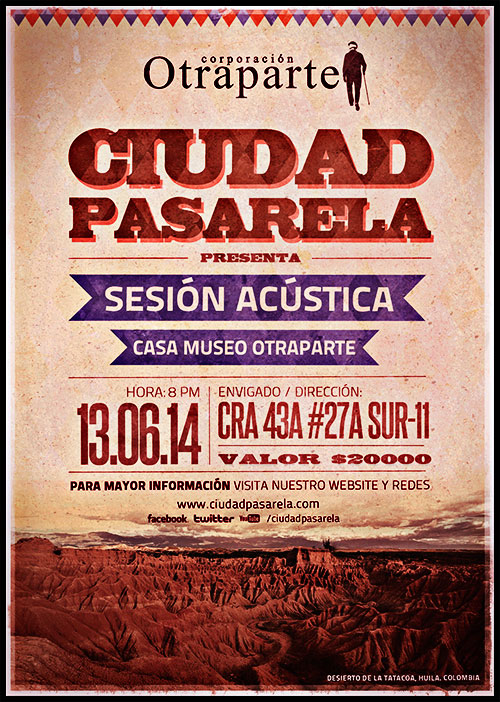 Durante los últimos siete años Ciudad Pasarela ha trabajado para crear rock de calidad. En un momento de la música local en el cual las fusiones se estaban tomando el mercado, Tj Donner y Camilo Galeano quisieron volver a sus raíces con la esperanza de encontrar un público dispuesto a escucharlos. Influenciados por las bandas clásicas británicas, estadounidenses y argentinas, decidieron hacer canciones que hablaran de las emociones humanas: el amor, la tristeza, la esperanza… Fue así como grabaron un primer disco, titulado “Ciudad Pasarela” (2008). Este trabajo les permitió tocar en diferentes escenarios de Medellín, incluyendo el Festival Altavoz, y lograr las primeras incursiones en la capital. De paso, llegó con un integrante nuevo, Mauricio Serna, quien había grabado, mezclado y coproducido el álbum y se les unió como guitarrista.