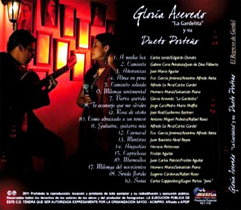 Queremos presentar un trabajo, que ya ha sido reclamado por muchos que conocen a Gloria y, que en buena hora se hace realidad: su primer CD. Es con gran satisfacción que ponemos a consideración del público estas sentidas canciones de Gloria Acevedo La Gardelita y su Dueto Porteño, fruto de su trabajo, su perseverancia y el esfuerzo de muchos que nos hemos identificado con esta joven artista, que es un caso raro de amor a Gardel y al tango y que, con inmenso talento, ha rescatado los hermosos temas que se incluyen en este álbum.